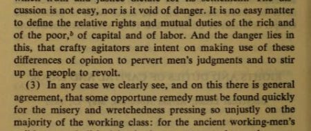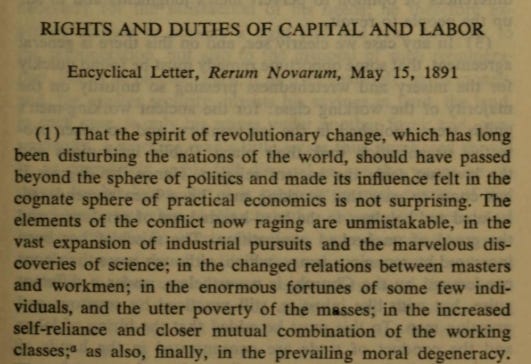 Subtitled “Rights and Duties of Capital and Labour”, or occasionally “On the Condition of the Working Class,” Rerum Novarum begins with the above passage.