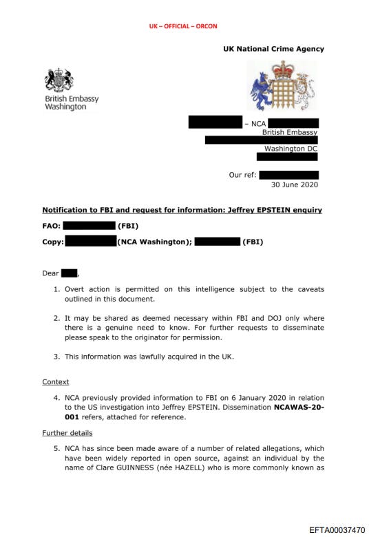 The Epstein Files reveal that in January 2020 the UK National Crime Agency contacted the US government via the British Embassy in Washington, to request information on Epstein and his close associate, Lady Clare Guinness.