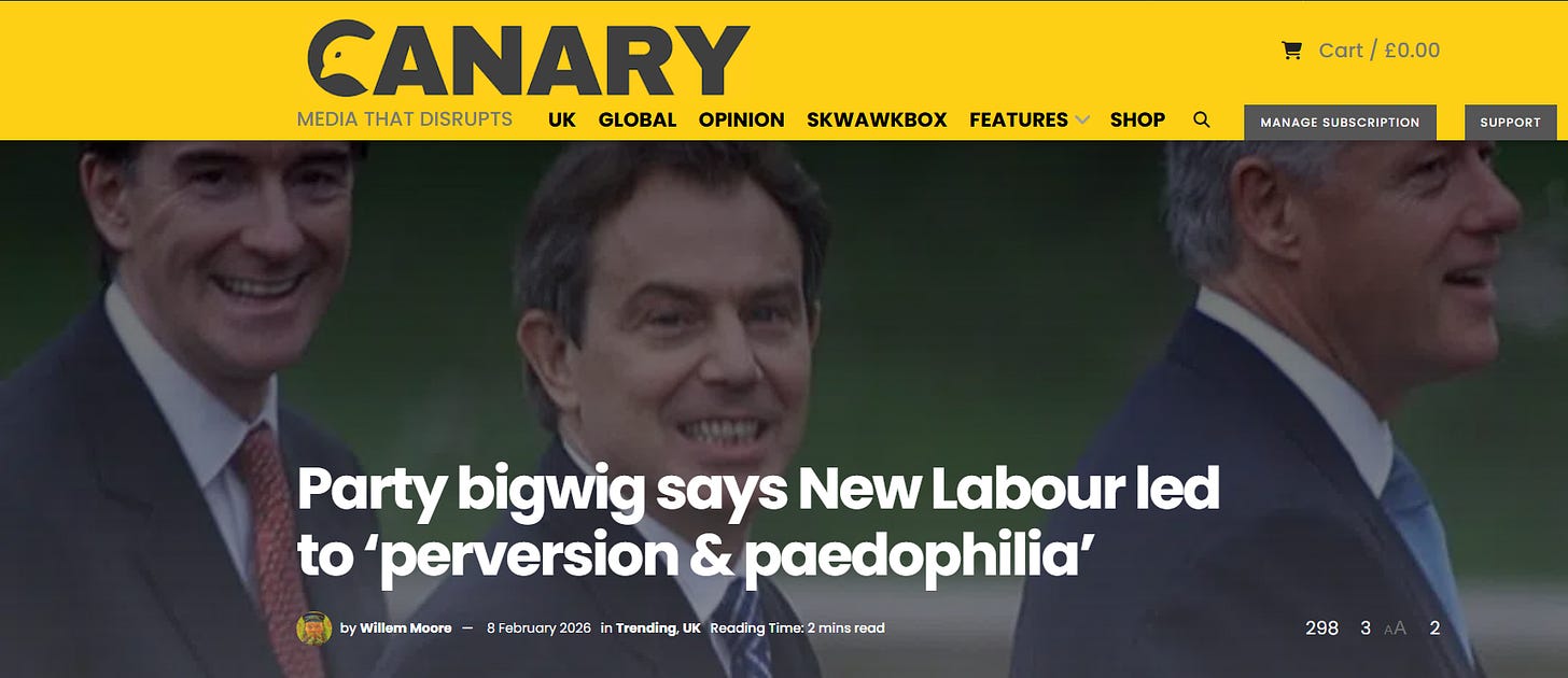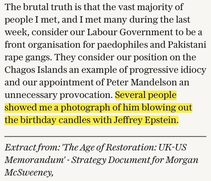 Starmer’s former Chief of Staff, Morgan McSweeney, was given his first job by Mandelson - running a blackmail database called Excalibur whose purpose was to secure the compliance of Labour MPs with Mandelson’s agenda.