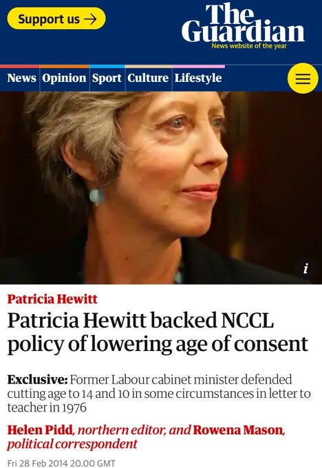 Harman, Hewitt, and Harman’s husband Jack Dromey all worked for the NCCL in the 1970s. They were all senior figures in New Labour. The NCCL granted “affiliate” status to PIE - the Pedophile Information Exchange in 1975.