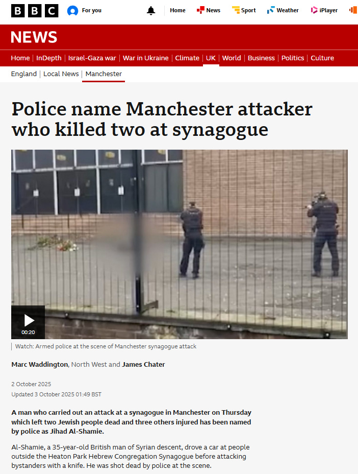 A man called “Jihadi from Syria” (Jihad al-Shamie) killed two Jewish men and sought to detonate a suspected suicide vest in Manchester yesterday.