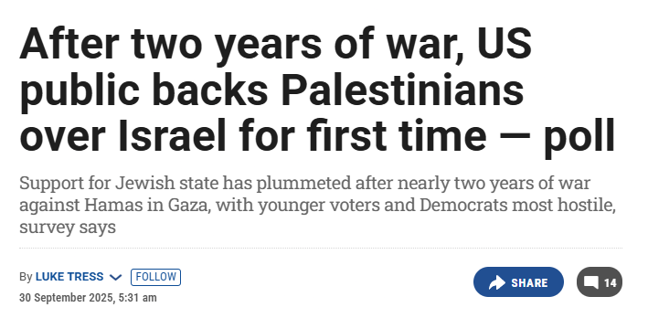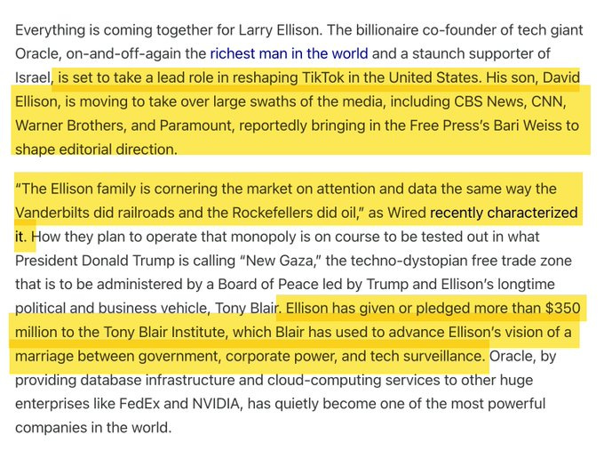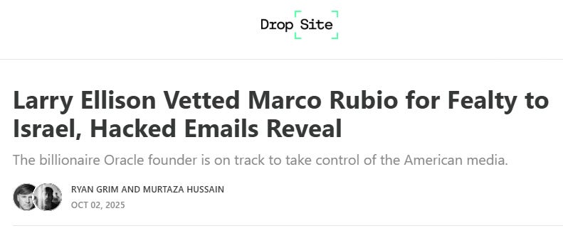 “The most important media story by far is how Larry Ellison -- the largest-ever private donor to IDF -- is buying up the largest media properties (not just CBS and Paramount but also TikTok), at exactly the same time support for Israel in the US is unravelling…”