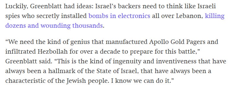 On the 7th of January 2025 Greenblatt called for the “ingenuity” behind the exploding pager attacks to be used in Israel’s “8th front” - the global war on “antisemitism”.