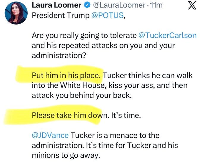 Laura Loomer, who is a Zionist lunatic, has also called for Carlson to be “taken down”.