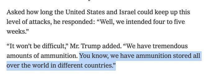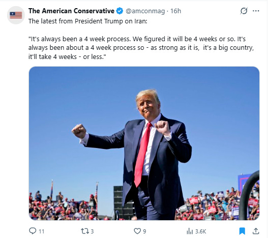 Hours later it is now “four to five weeks”, and Trump is already talking about depleted missile stocks.