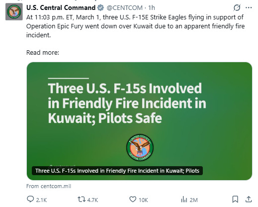 Practically every regional US military ground asset has been struck. Some severely damaged. The US 5th fleet HQ has been on fire for two days.