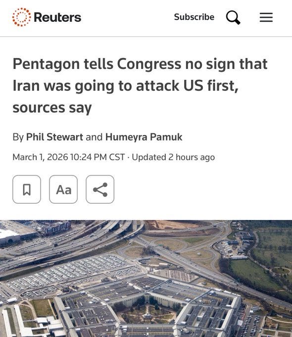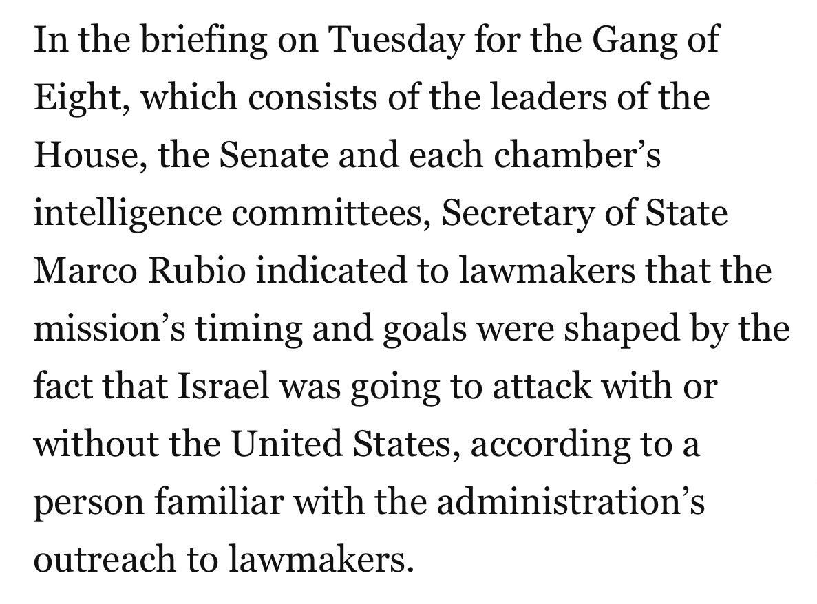 Reports now confirm the war was not only launched because the negotiations were successful, but had been planned weeks beforehand. Last week the US Secretary of State Marco Rubio told the “Gang of Eight” the US will launch the war because Israel was going to do so anyway.