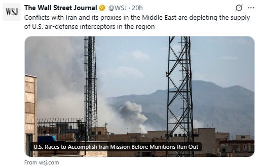 The Washington Post reports the Pentagon has warned the US will run out of missiles if the war “extends beyond a few days”. The mood is apparently “intense and paranoid”.