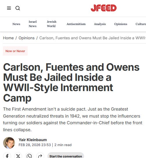Jewish outlet Jfeed has called for Nick Fuentes, Tucker Carlson and Candace Owens to be jailed in camps for not supporting Israel’s latest war.