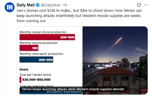 Iran has also begun to drain the limited stocks of Israeli/US air defence THAAD and Patriot missiles.