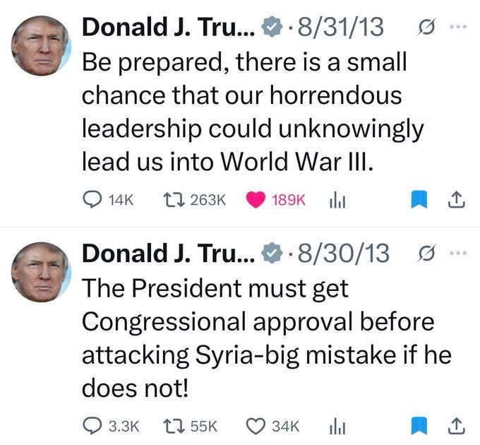 His Director of National Intelligence Tulsi Gabbard said of US strikes on Iran in 2020 “Trump has launched this war without Congressional authority” and asks what he is going to do to prevent further escalation.