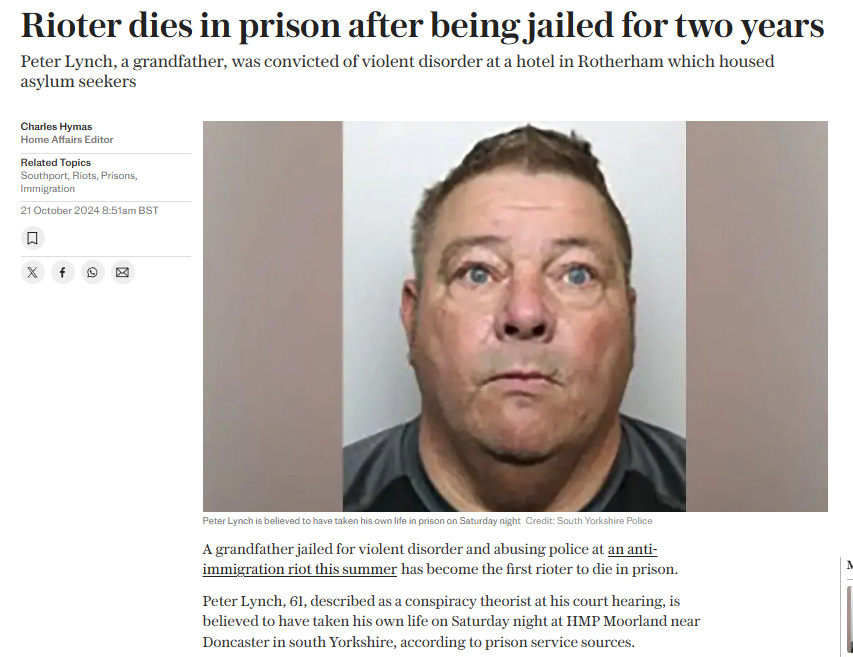 Peter Lynch took his own life in prison. The judges who jail British people for speaking the awful truth to power have routinely released convicted child sex offenders without prison sentences. The feminist campaigner “Pagliacci the hated” has compiled a “Same judges” list over several years showing how the same judges who release convicted child sex offenders also jail British people for “speech crimes” - often for their condemnation of crimes against British children.