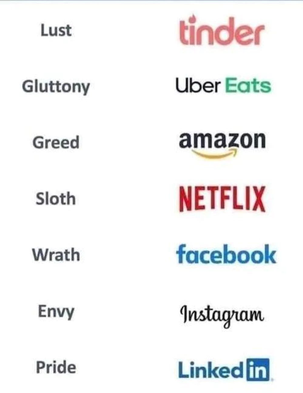 Moral inversion also means what you think it means. That all the vices are indeed virtues now is a cliché. Consider the following meme: