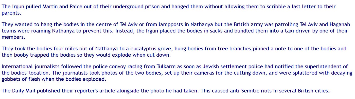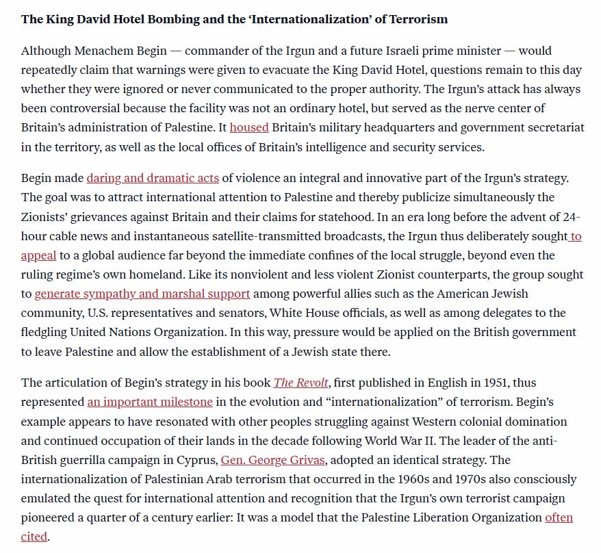 This is the reason the British Mandate came to an end in Palestine. Jewish terrorism made it impossible to govern. The role Jewish terrorism played in the proclamation of Israel is unknown today.