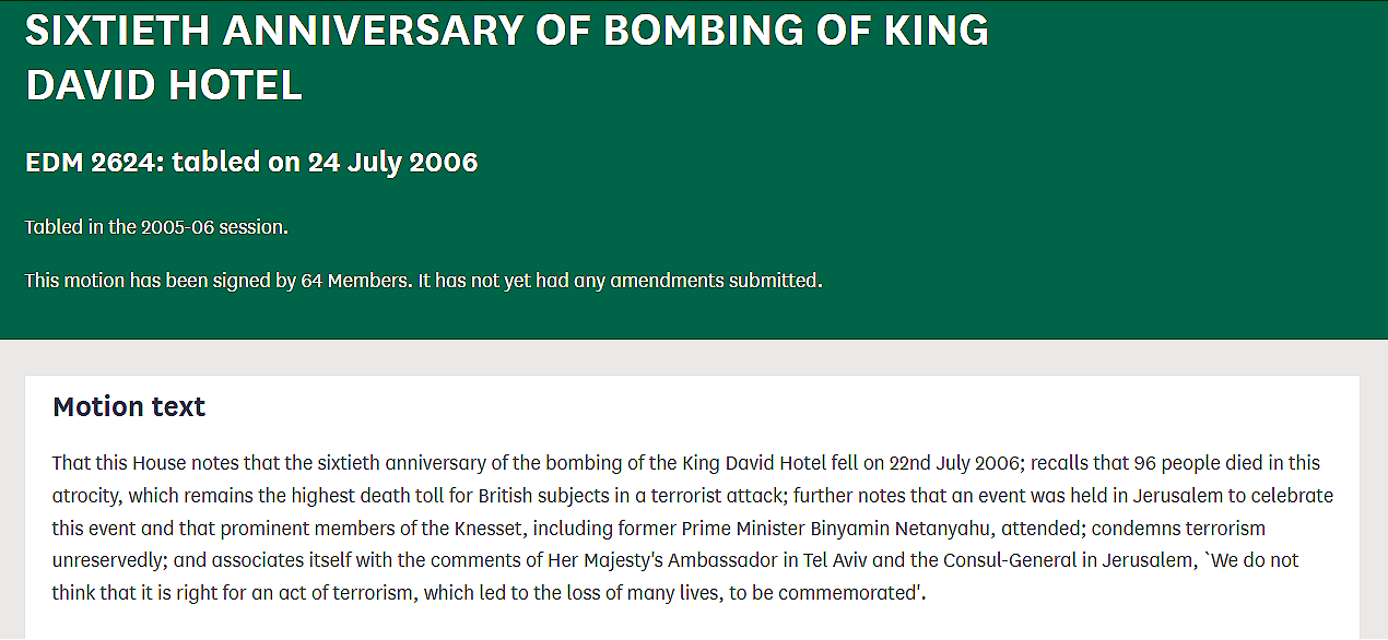 Sixty years later Benjamin Netanyahu led a celebration to commemorate the bombing of the King David Hotel - a move which was condemned in Parliament as an insult and an outrage by 64 MPs.