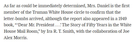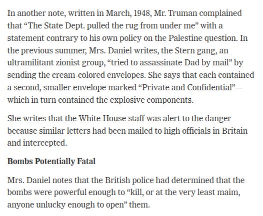The terrorist “Stern Gang” (Lehi) tried to assassinate the US President Harry Truman in 1947, sending him letter bombs. Margaret Truman Daniel, Truman’s daughter, recorded the plot in a biography of her father.