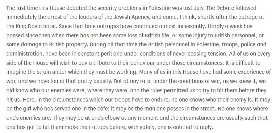The British Mandate was untenable, it was said, because the Jewish terrorists had not only committed repeated atrocities - but had succeeded in corrupting law and justice and replacing it with violence.