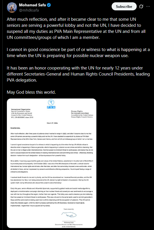 Here is a letter of resignation of Mohammed Safa, Palestinian diplomatic representative at the UN. He has routinely protested that voices such as his are silenced by pro-Israeli censorship of online media.