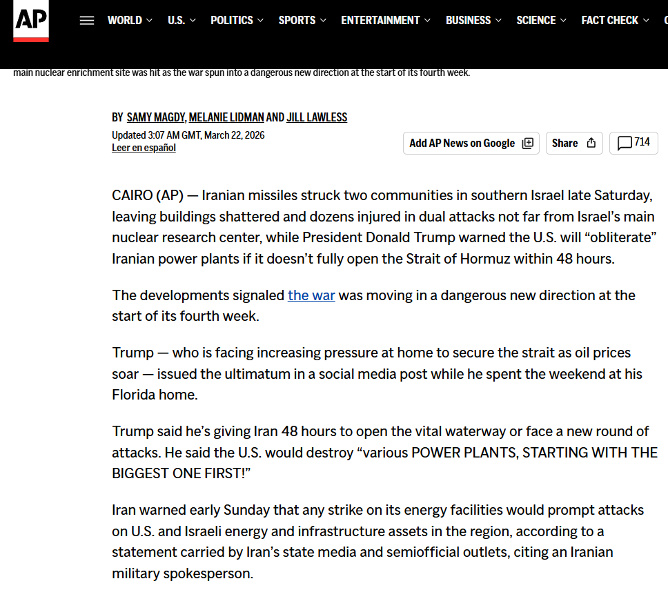 Imagine the US/Israel plan “wins”. Iran’s power grid is destroyed, the state collapses, the region’s oil and gas all goes offline, no one can guarantee shipping safety in the resulting chaos, the straits close permanently and the market dies.