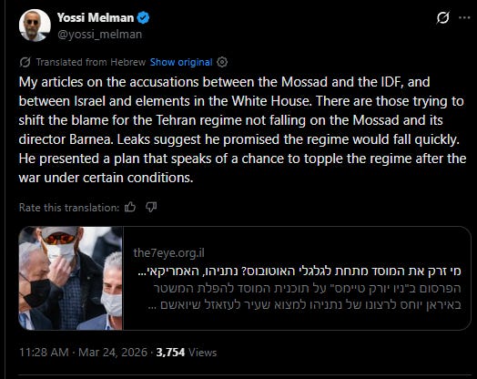 A different world view in the Hebrew press in Israel. Read Yossi Melman’s article here (machine translation here) Barnea (who had previously been living at the White House in the runup to the war) said he gave no guarantee of a quick regime change, insisting that Netanyahu was told the protests would take months to come to this result (if ever).